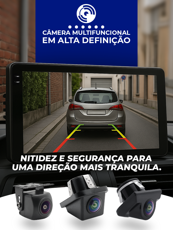 As câmeras possuem lente grande angular de 170° que proporciona cobertura máxima de pontos cegos, orientando motoristas para áreas de estacionamento seguras. Com opções de resolução AHD de 720P ou 1080P, e suporte articulado, tartaruga quadrada ou tartaruga redonda de metal, o dispositivo garante uma fácil instalação.